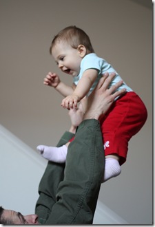 Our little girl is just bucket loads of fun. We’ve been working on waving with her lately and today when Mark was standing at the door ready to leave, she waved bye bye to him all by herself. We didn’t tell her to wave or wave at her or anything. It was just too cute and Mark almost didn’t leave after that because he wanted to stay and play with her.